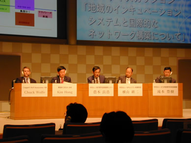 日本工業大学の産学リエゾンセンター・増田教授が星野さんに「現場の泥臭い支援をやっているIMを紹介して欲しい」との話があった時に、ありがたいことに私を紹介いただいたことで、東京工大・百年記念館でサイエンスパーク研究会でプレゼンテーションをする機会を得ることができた。 また、北九州で開催された国際ビジネスインキュベーション・シンポジウムの中で、国際的なパネルディスカッションが行われ、NBIAのダイアナ・アトキンス会長がコーディネータ、パネラーとしてアメリカのチャック・ウルフ氏や韓国のキム・ホン教授などと一緒に参加した。滅多に経験できない同時通訳による国際的なパネルディスカッションに参加できたことは、非常に印象深い経験であった。 JANBOでの仕事を通して、ベンチャーキッズスクールのことも知り、そのパイオニアである早稲田大学・大江教授、それに教え子のセルフウィング・平井社長との縁も得ることができた。 |