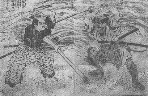 比較C『丹治峯均筆記』 二天一流の伝承者・丹治峯均が書いたとされるこの書は、『二天記』とほぼ同時代の成立といわれる。ここで目につくのは、まず小次郎の姓が「津田」となっている点である。また、決闘の発端は、小次郎が武蔵の父・無二に試合を望んだこととされている。しかし無二は、小次郎が持っている「仕込みの剣の木刀」を恐れ、勝負を辞退。それを受けて、武蔵が小次郎を対戦することになったとある。そして武蔵は遅参戦法をとらず、早めに島に渡って小次郎を待っていた。武蔵の剣もひと味違い、舟の櫂を4尺に切ったものを用い、刃の部分には2寸釘を隙間無く打っていたという。立ち合いについても、武蔵は無傷でなく、打たれた首からは血が流れ、衿でその傷を隠したことになっている。 |