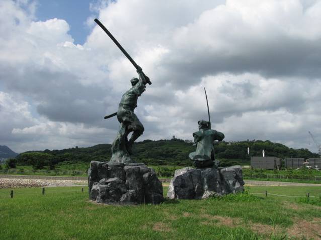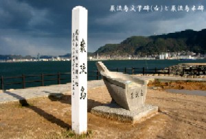 比較@『小倉碑文』 『小倉碑文』とは、武蔵の養子・伊織が、武蔵が死んだ9年後に建てた武蔵顕彰碑に刻まれている記録である。そのなかに「長門と豊前の海の間に舟島という島がある。両雄は同時に相会した」という記述がある。「舟島」とは巌流島のことで、後に小次郎の流派「巌流」にちなんで巌流島と呼ばれるようになった。『二天記』では、武蔵は遅参戦法をとって小次郎をじらせたことになっているが、ここでは同時に島に到着し、試合に臨んだと記されている。 |