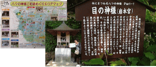 八つの神様巡りエリアマップができており、分かりやすく なりました。それぞれの場所には、立て札があり、細かい 説明が記載されています。その立札と神様の写真を付け ますので、読んでいただきたいと思います。 では「目の神様」からスタート! 物産館の最も近くにあります。 |