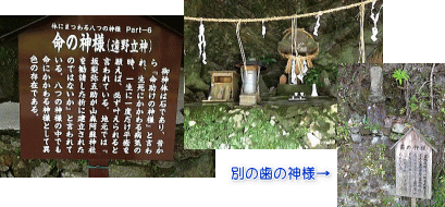 六番目は、「命の神様」。 五番目の「歯の神様」から「命の神様」 に行く途中に、別の「歯の神様」を 見つけました。 まだまだ他にも、ありそうだと実感しま した。 「命の神様」は人の根源に関わる 神様であり、ゆっくりと参拝しました。 |