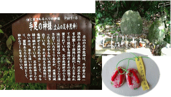 三番目は「胃の神様」。 ここには、竹の杖が十本ほど置いてあります。 急な山路を200mほど登りましたが、運動不足 気味の私にとっては、途中から杖の有難みを 実感しました。どのくらい登るのかも分からない のでなおさらです。 胃の神様の横には、どういうわけか、三猿の 「見猿」の大きな石像が置いてありました。 お供え場所にも、三猿が・・・ 何故??? |