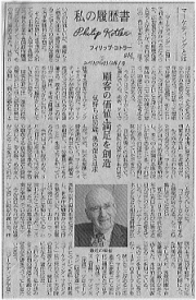 昨年の12月の日経新聞「私の履歴書」は、フィリップ・コトラーが取り上げられた。当然、日本の新聞への寄稿なので、日本を意識した形で書かれているので、身近に感じることも多く記載されている。 前回も伝えてように、マーケッティングの権威であるコトラーが言っている中で、ソーシャルメディアの出現により、マーケッティングも大きく変わるタイミングに来ていると考えており、「マーケッティング3.0」とか、「ソーシャルメディア・マーケッティング」と言う言葉が強く意識され始めている。 P.F・ドラッカーが「企業の目的は顧客の創造である。マーケッティングとイノベーションだけが成果をもたらす。」と述べているが、今回のシリーズ掲載の中で、大先輩ドラッカーとの出会いがコトラーの考えに大きく影響している場面もあり、興味を持って読み進めていった。 出だしは「マーケッティングとは」から始まっている。 マーケッティングは「業績向上と顧客の価値・満足を創造することで、人々の生活の改善を目指す」ことにある。3P(製品・価格・販促)と1D(流通)をリチャード・クルエットが提唱したが、マーケッティングのキーワードである4P(製品:プロダクト、価格:プライス、流通:プレイス、販促:プロモーション)を言い出したのは、ジェリー・マッカーシーとのことだが、それを企業に広めたのはコトラーのようである。 |