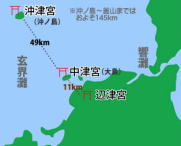 ここ宗像の地は、中国大陸や朝鮮半島に最も近く、外国との貿易や進んだ文化を受け入れる窓口として重要な位置であった。日本最古の歴史書といわれる「日本書紀」には、「歴代天皇のまつりごとを助け、丁重な祭祀を受けられよ」との 神勅(しんちょく)(天照大神のお言葉)により、三女神がこの宗像の地に降りられ、お祀りされるようになったことが記されているとのこと。 『古事記』『日本書紀』によれば、三女神は天照大神(あまてらすおおみかみ)と素戔嗚尊(すさのおのみこと)の誓約(うけい)のもとに誕生し、天照大神の神勅によって、大陸との交通の要路にあたる「海北道中(かいほくどうちゅう)」(宗像より朝鮮半島に向かう古代海路)に降臨し、以降、国家の守護神として崇敬されている。 また「日本書紀」には、宗像三女神が「道主貴(みちぬしのむち)」、すなわち国民のあらゆる道をお導きになる最も尊い神として崇敬を受けていたことが 記されている。「貴」とは最も高貴な神に贈られる尊称である。道主貴(※宗像三女神)以外には、伊勢神宮の 大日靈貴(おおひるめのむち)(※天照大神)、出雲大社の大己貴(おおなむち)(※大国主命)のみなので、宗像三女神が皇室をはじめ人々からいかに篤い崇敬を受けられていたかがうかがえる。 今回は、総社・辺津宮で第二宮、第三宮の参拝をしてきたが、次回は中津宮(大島)、女人禁制の沖津宮(沖ノ島)まで行く機会をつくりたいと思った次第である。 少し調べただけでも、多くの物語を有する神社で、宗像大神をお祀りする神社は、厳島神社、出雲大社など、全国各地にある約6200社の総本宮とのこと。 宗像大社が交通安全の神であると聞いたが、もともとは海の交通安全から始まったそうで、秋には「みあれ祭・海上神幸」で大漁旗を棚引かせた漁船団が集合して祈願するそうである。タクシー運転手から聞いた話ですが、出光佐三が宗像大社の近くの赤間宿出身で、私財を投じて宗像大社を立て直し、今でも出光の社員が全国から参拝に来るような話も聞きました。宗像大社の総代を、亡くなるまでしていたそうです。 出光佐三については、少し縁もあり興味を持っていたこともあり、調べてみようと思います。 感謝です! |
