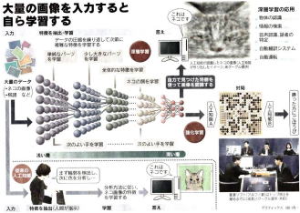 つい最近の人工知能の話題として「アルファー碁がトッププロに4勝1敗で勝った」話などがある。棋譜のパターンがオセロは10の60乗、チェスは10の120乗,将棋は10の220乗,対して囲碁は10の360乗と膨大であり、人工知能がトッププロに勝つには、まだ10年以上かかると言われていた。 ところがディープラーニングを活用した「アルファー碁」により、人工知能の勝利が現実のものとなった。 グーグル傘下のAI開発ベンチャー「ディープマインド社」が開発した人工知能「アルファー碁」を深層学習させた上で、人工知能同士で対局(強化学習)を行わせた上で、プロ棋士との対戦に臨んだとのこと。日経新聞に掲載された図が分かりやすいので添付しておく。 |