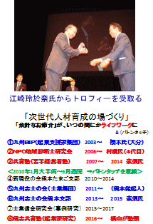 私の次世代人材育成に関与するキッカケは、県支援センターPMの時に、創業・ベンチャー国民フォーラム(江崎玲於奈会長)から起業支援家部門会長賞をいただいたことにある。同年に経産局の支援を受け、九州での起業家支援人材(IM)の相互研鑽の場/九州BIPを、長崎のIMと一緒に立ち上げた。私は「相互研鑽の場」は「次世代人材育成の場」でもあると思っており、その後も様々な「次世代人材育成の場づくり」を行ってきたが、それぞれに思いはあるものの、うまく継続できなかったものもあるが、それらを時系列で列挙してみる。 継続中の ①九州BIP(IM集団)、②NPO地域診断士研究会(若手診断士)、③共育塾(若手経営者塾)、④九州志士の会(士業集団)、⑤肥後創成塾(熊本市・学園大)、⑥九州志士の会熊本支部(士業集団)、⑦熊志共育塾(ステップアップ経営者) 活動停止 ①新現役の会熊本たまご支部、②士業信金研究会(事例研究)、③企業支援力向上研究会(事例研究) その中でも特に「強い思い」がある3つの場について触れてみたい。 |