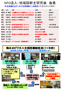 ①NPO法人 地域診断士研究会(12年目) 支援センターPMとIM活動がキッカケで、東京はじめ北は北海道から南は沖縄まで活動する場をいただき、年中無休で面白く仕事をしていた頃の話である。某企業内診断士から「横山さんは何故熊本にいて、全国的な活動をしているか知りたい診断士が多くいる。是非、教えてほしい。」との話があり「自分の恥をさらす面もあるが、お役に立つのであれば・・・」ということで、企業内診断士を中心に、2006年に地域診断士研究会を立ち上げた。 最近は自主勉強・研究会活動を中心に、図書館での「起業経営相談会」なども行っている。発足時は企業内診断士が殆どだったが、いつの間にか「よろず支援拠点」「県経営支援サポートオフィス」「市企業支援センター」「インキュベータ」や「県診断士協会」「九州志士の会」等の要職で活躍する集団になっているのは嬉しいことである。今年は日本政策金融公庫・熊本創業支援センターとの共催で、起業セミナー「熊本モデル」の立ち上げを行ったが、来年以降も共催で継続実施していくことになった。今年から村橋さんが4代目代表としてステップアップを目指している。 |