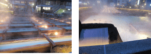 それから草津温泉に夕方到着し、先ず食事の前にガイドさんお勧めの湯畑見学に行きました。湯畑とは、湯の花を取るために作られた水路のようですが、温泉を折り返し折り返して流しており、草津温泉の町中にあるためにいつの間にか観光名所になったようです。日暮れ時だったこともあり、温泉の湯気が立ちこめて何とも言えない幽玄な雰囲気でした。 |