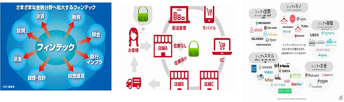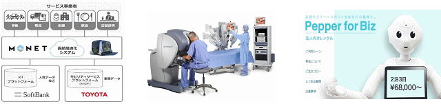 *フィンテック(金融)業界 :金融・証券・保険業界の自由化による業界破壊の推進 例)融資、決済、保険、資産管理・運用、クラウドファンディング、スマホ決済 *シェアリング・エコノミー :企業・企業、企業・顧客、顧客・顧客を繋ぐ新たな仕組み 例)車:Uber、宿泊:Airbnb、フリマ:メルカリ、クラウドワークス、ソーシャルファンド *製造業のサービス産業化 :モノとサービスを融合し新たな産業づくり 例)コマツ(コムトラックス)、トヨタとソフトバンク提携(モネテクノロジーズ:モネット) *ECと店舗の融合 :新たな流通業界の再構築化で新たな産業づくり 例)アマゾンはEC+店舗展開へ、ウォルマート(世界最大売上企業)店舗+ECへ *世界的デジタル経済圏の構築 :プラットフォーム企業がデータ活用で独り勝ちへ 例)アマゾン経済圏などのGAFA(米国:グーグル、アップル、フェイスブック、アマゾン)、アリババ経済圏などのBAT(中国:バイドゥ、アリババ、テンセント)、日本では楽天経済圏など *自動車産業 :自動車業界の業種の枠を超えた新たな産業づくりへ 例)CASE(コネクト、自動運転、シェアリング、電動化)、空飛ぶ車、ドローン *ロボット :実用ロボットの多様な業界展開へ 例)掃除ロボット、サービスロボット(ペッパー)、家事ロボット、介護ロボット、手術ロボット(ダヴィンチ)、危険作業ロボット、軍事ロボットなどなど *医療産業 :今まで聖域だった成長業界で、生産性向上、品質向上などが開始例)画像診断支援、カルテ作成支援、ゲノム解析、医薬開発支援 *エンターテインメント :AI活用により人知を超えた世界が実現 例)ゲーム(VR:仮想現実、AR:拡張現実、MR:複合現実)、囲碁将棋、Eスポーツ |