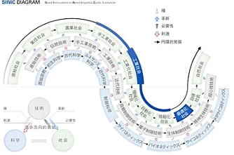 前述のように世界情勢においても、デジタル技術によるパラダイムシフト・プロセスの中で、「企業のグローバル化・巨大化(GAFA)」「自国中心主義と国内多極化(米国トランプ政権、米中間の多面的軋轢)」「国家と企業の軋轢拡大(EUとGAFA)」などが進行しており、日本としての対応も動き始めている。 立石一真氏がSINIC理論で「工業社会の最終段階」である情報化社会(1975~2004年)が過ぎて、現在は最適化社会(2005~2024年)にあり、「破壊と創造が交錯する20年」と位置付けている。次の自律化社会(2025~2033年)で新たな社会づくり(知識産業⇒智慧産業)に向かうと述べている。 |