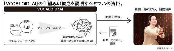 肝心の「歌声」は、深層学習技術(ディープラーニング)を用いた「VOCALOID: AI」を開発したヤマハが担当した。 VOCALOID(ボーカロイド)と言えば初音ミクで知られる音声合成技術である。「VOCALOID: AI」はAIを活用したその一種で、ディープラーニング(深層学習)によって歌手独特の癖やニュアンスを含んだ歌声を加える技術である。メインAIのほかに、「音程、タイミング、ビブラート、音色の4つの機能に特化したAI」を配置した。 過去に発売されたレコードを学習させて作成し完成させたが、多様な関係者による試聴評価を聞いて、忠実な再現では「ひばりの魅力である人間味や観客感動」がないことがハッキリと分かった。 |