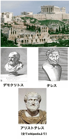 ②自分で考える人(哲学者)の出現 :古代ギリシャ都市国家の時代に、ポリスに様々な賢者が集合し議論を重ねるようになり、全てを神(ギリシャ神話)に依存するのではなく、自分たちで考える時代を迎えた。「どうしたら戦争のない社会をつくれるか」などを含めて、様々な真理を自分達で解明しようと考える人が出てきたわけだが、哲学の始祖といわれるターレスが出現したのも、そのような時代背景にある。彼は理性を駆使して宇宙や世界を構成する「万物の根源」を探求し、「万物の根源(アルケー)は水である」とし、その原理を追求した。それらに刺激を受けた後継者たちがそれを発展させてきた。 |