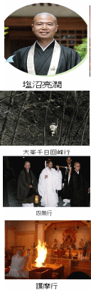 彼は修験道1300年の歴史の中で、2人しか成し遂げた者がいない荒行・大峯千日回峰行の満行を果たした人で、現在は自ら建立した福聚山慈眼寺の住職をしている。(比叡山千日回峰行の満行者は51人いるが、大峯山千日回峰行とは難易度がだいぶ異なるようである。) 大峯千日回峰行とは、吉野から大峯山まで片道24キロ(往復48キロ)、高低差1400メートルの山道を1日16時間かけて、一日も休まず1000日に渡って日々往復する。1年のうち修業期間は5月~9月に限られており、満行まで9年かかる。たとえ病や怪我、嵐の日であろうと、行半ばで止めることは許されない。毎日23時起床、滝行を行いオニギリ1個を食べて、死出の旅を意味する白装束に身を包み、午前0時半に出発。迫りくるあらゆる限界に耐え、ひたむきに歩き続けて往復を繰り返す。途中挫折すると、その場で自作の小刀で切腹する習わしとのこと。 更に「一切の食物、水を断ち、眠らず、横にならず」、これを貫くこと9日間、堂に籠り真言を唱え続ける「四無行(断食、断水、断眠、断臥)」に挑む。行の最中に命を落とすこともある過酷さで、あらゆる感覚が研ぎ澄まされ、線香の灰が折れて落ちる音さえも聞こえたという。その厳しさゆえに、現代では千日回峰を果たした者にしか許されない、命を賭けた難行である。 |