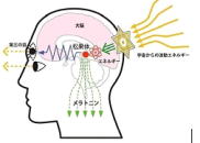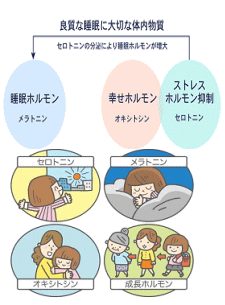 先ず、ストレスを消す3つのハッピーホルモンとして、「セロトニン(ストレスや鬱にもかかわる“幸せホルモン”)」「メラトニン(夜になると分泌される“睡眠ホルモン”)」「オキシトシン(人との触れ合いで増える“愛情ホルモン”)」の3つの相乗作用で引き起こされる。具体的にいうと、 「セロトニン神経」を鍛えるには、「太陽光を浴びる」や「リズム運動」「スキンシップ」が大切である。そして「セロトニン神経」を鍛えておくと、夜になると「メラトニン」が分泌されて眠くなり、深い睡眠を誘発し、「脳内記憶の整理」「破壊細胞の修復」などがキチンとされ、清々しい朝を迎えることができる。 「オキシトシン」は人との触れ合い“スキンシップ”で醸成されるが、そのことにより「セロトニン物質」を活性化させる。 |