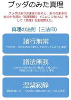 *涅槃寂静とは、「二つの真理を実践・体得することで、我々は心安らかな悟りの境地(偏らない心、囚われない心、拘らない心)に至る」ことができます。「求めれば求めるほど、悟りの境地から離れていく」のではないかと感じました。 |