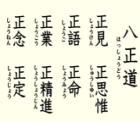 「八正道」とは、以下の八つの「正しい認識や正しい言葉」を実践することです。 *正見 :正しいものの観方をする(固定概念をなくす) *正思惟:正しい認識や判断をする(真善美を基軸に置く) *正語 :いい加減な発言を慎む(嘘や悪口を言わない) *生命 :迷惑をかけずに規則正しい生活をする(思いやりの心を持つ) *正精進:悟りに向かい正しい努力をする(一生懸命に努力する) *正念 :正しい教えを心に留める(自利・利他の心を持つ) *正定 :正しい精神統一をする(座禅:只管打坐を実践する) 次回に続く |