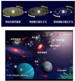 ●太陽系の始まり 宇宙には星間物質(ガス、チリ)が漂っている。 宇宙の始まりの時に生成された水素などの分子や恒星が寿命を終えて爆発、放出した物質だ。星間物質に濃淡ができると引力でチリが引き寄せられて回転し、更に物質が集まる。(風呂の水を抜くと排水溝の周りで、水が渦巻くのと同じだ。) 全体の大きな回転の中心に、多くの小さな回転が生まれる。 大きな回転の中心には莫大な物質が集まり、小さな回転の中心には少量の物質が集まる。物質が集まると温度が上がる。数百万℃に達すると核融合が始まり輝き始める。それが恒星だ。 太陽系には恒星が一つだが、2つ3つの場合もある。 |