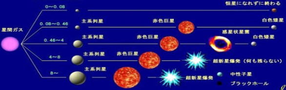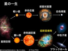 ★超新星爆発 もし太陽が10倍以上重かったなら、「超新星爆発」を起こして太陽系を吹き飛ばすだけではなく、近隣の星(50光年程度)にもダメージを与える。 既に赤色巨星になっているベテルギウスとアンタレスは超新星爆発を起こしても、十分に遠いから(600光年以上)地球は致命的ダメージ(生物絶滅)は起きないが、電波障害、通信障害で世界は大混乱に陥るだろう。 最も近い星シリウス(8光年)、ベガ(25光年)は、あまり大きくない(太陽の2、3倍)から超新星爆発は起こさず、太陽のように赤色巨星となり白色矮星となる。しかし地球にも、三葉虫の絶滅など、近隣の超新星爆発の影響を受けた痕跡がある。