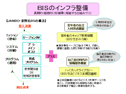 この10年間の地域中小企業支援の活動を通して、「情報が氾濫する一方で 依存型社会が形成され、自立性に乏しい人たちがますます多くなってきている」 なかで「21世紀の明るい日本社会に必要とされることは、自立性の高い人材を 一人でも多く増やしていくこと」ではないかと痛切に感じるようになった。自立性が 高い人材ということは、自己選択・自己決断・自己責任を取れる人材である。 これを実現していくには、近視眼的な考え方で策を講じるのではなく、長期的観点 から手を打っていくことが非常に大切である。 そういう意味でも、子供の教育のあり方の見直しや、自己責任を求められる時代 の社会インフラのあり方などに手をつけていく必要が出てくる。「実社会とリンク したキャリア教育」や、「図書館の情報収集拠点化」などは、その実現の切り口と して、望ましい活動になりうると考えている。従って、このような社会インフラの 整備による「時間軸を加えた、地域社会のビジネス・インキュベーションシステムの 構築」の重要性を強く感じている。 |