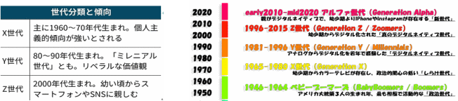 (3)Z世代(2000年代生まれ) すでにインターネットが普及していた時代に生まれた「デジタルネイティブ」と呼ばれる世代。 ネットリテラシーが高く、新しいテクノロジーへの関心が高い。 ・デジタルネイティブ ・起業家精神が旺盛 ・SNSを使いこなすが、頼っているわけではない ・前向きながら心配性で、安定すると逆に不安になる ・上司の指示は理解するが、従うかどうかは自分が決める ・プライバシー保護意識が高い ・変化に柔軟 ・ブランドではなく、本質に価値基準を置く ・オンタイムで仲間とコミュニケーションを取る ・東日本大震災を経験しているため、社会課題への意識が高い |