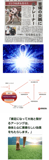 当療法は欧州のサッカーチームや米国のメジャーリーガーでも有名だそうで、松井秀喜もメジャー選手時代には継続的に施術してもらっていたようです。(松井選手からは、専属トレーナー就任依頼もあったようですが、活動が制約を受けるのでできないと断ったとのこと) 『筋肉には「関節を動かす」「関節を守る」という2つの役割があり、「関節を守る」役割によって筋肉が正しく動いていれば、「痛み」が出ることはない。』 当療法では、動きが鈍くなってしまった筋肉に対し、体が防御反応を起こさないようソフトな刺激を与え、正しい運動反射弓を引き出します。そうすることで神経伝達の正常化を図り、本来の筋肉の動きを取り戻していきます。筋肉が正常に働けば血流もスムーズになるため、血行不良によるさまざまな不調の改善効果が期待できるようです。 筋反射テストを受けたあとで、背骨と両足の関節、両腕の関節を痛くない範囲で動かして、再度、筋反射テストを受けるやり方です。(いろいろノウハウが詰まっているようです) 再度の筋反射テストの結果もだいぶ改善されていました。 筋肉や関節に痛くなるような負荷をかけないことが原則のようです。おかげで体のバランスも良くなったようで、スッキリしました。吉本さんの「気」に関する興味深い話にも刺激を受け、新たな視点に気付くことができました。 何よりも違った視点からの「筋肉・間接・神経・脳」の関係や「気や心」に関する話には、新たに気付くことがあり、いつもいい刺激をもらいます。 特にアーシング(earthing:地面と繋がる健康法)には興味を持ちました。 アーシング – 地面とつながる健康法 (earthing.jp) |