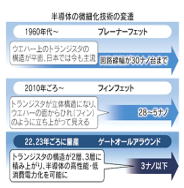 日経新聞のディープインサイト「IBM・インテルも来るか」の記事で、半導体の日本の位置づけは、前述のように1980年代の日米貿易摩擦を経て、日本はすでに半導体後進国に成り下がってしまった。 半導体微細化技術は、「①プレーナーフェット(30ナノ台まで:1960年からの平面構造)」、「②フィンフェット(28~5ナノ:2010年からの立体構造)」、「③ゲートオールアラウンド(3ナノ以下:2層3層構造のもので、もうすぐ量産化される段階にある:米インテル、台湾TSMC、韓国サムソン電子が先行)」と進化し続けているようである。 |