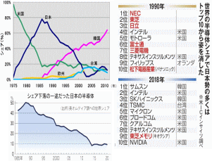 1980年頃は日本が世界の半導体市場を席捲していた。 1960年ぐらいから1985年ぐらいまでの「奇跡の日本高度経済成長」を支えた産業の一つが「半導体産業」であった。1988年度の日本の半導体の世界シェアは50.3%で、アメリカが36.8%、アジアが3.3%であった。しかし大型コンピュータからPCに主流が移り、インテルはDRAM生産を止めて、マイクロプロセッサーにシフトし、その分野で世界を制覇した。 |