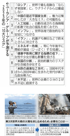 明けましておめでとうございます。 コロナ禍にも慣れた感じがあり、日本ではワクチンや治療薬も整ってきて死亡者も減り、今年はそのうちに「分類5」に見直しがされそうです。 ユーラシアグループ「今年の世界10大リスク」のトップはロシア危機。ロシア・ウクライナ侵略が長期継続し、世界情勢の不安定化が今後どう進んでいくかが心配です。日経新聞には『世界が「戦前」に突入した』との記事もありました。 2位は中国の習近平の独裁体制。権力の集中し過ぎにより、取り巻きは異議を唱えることができず、内政・外交とも「大きなミス」が心配されます。中国・台湾問題、コロナ施策が準備なしでの急転回、住宅バブル崩壊や景気減速を含めた経済対策など、また国民不満も表面化したり、だいぶ不安も高まっているようです。 3位はSNS・AI等の新たなテクノロジーによる社会混乱。人工知能の進化とソーシャルメディアの普及が重なり、利便性や効率が高まった反面、フェイクニュースや陰謀論が拡散されやすくなっていると指摘しています。 4位は世界的なインフレの影響では、世界の中央銀行がインフレ抑制に向けて金融引き締めを続けるなか「世界は景気後退に追い込まれる」と予測。 5位として、抗議デモが拡大しているイランについて、同国の政権崩壊が起こる可能性は低いとしながらも「イランがデモ参加者を支援する国々に対して暴挙に出るきっかけとなる」と予測。 6位以下は、「エネルギー危機」「健康・教育に関する指標の低下」「米国の分断」「米欧の過激なZ世代」「水不足」となっています。 |