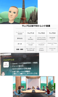 最近の日経ビジネスや日経新聞などに「メタバース」「ウェブ3」「チャットGPT」に関する情報が頻繁に掲載されています。 特に、日経新聞“やさしい経済学”、『「デジタル」を見極める』が7回シリーズで連載されました。京都大学特任准教授・山本康正(ハーバード大修士、東京大修士:専門は技術経営・未来学)の連載記事で、最近の米国と日本で学んだ「若手バリバリ」の意見は、知っておく価値があると思いチェックしました。 概要は「日本は技術ビジネス音痴」「根源的な悪影響は前例主義や年功序列」だそうです。「ゲームチェンジが起きた際、その技術が社会に浸透するかどうかを見極めるにはどうすればよいか。質の高い意思決定とはどのようなものかを考えます。」との記事です。 |