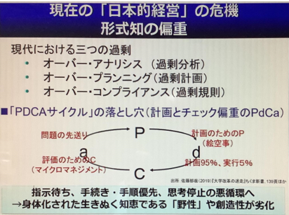 私が野中先生のヒューマナイジング・ストラテジーの講演を聴くのは、合計4回目(2021,2022,2023×2)になるが、今回の話を聞いた後で整理して改めて思ったのが、「日本的経営の劣化に対する危機感」の強さである。