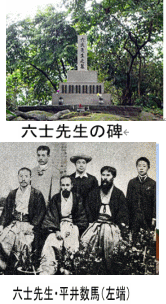 次に有名なのが「六士先生」。 「学務官僚遭難之碑」「芝山巌神社」:芝山巌学堂(しざんがんがくどう)で抗日事件により殺害された日本人教師6人のことです。日本の統治に反対する勢力による暴動が頻発すると、周辺住人は教師たちに避難を勧めたが、彼らは「死して余栄あり、実に死に甲斐あり」と教育に命を懸けていることを示し、芝山巌を去ろうとはしなかったそうです。教師たちはゲリラたちに説諭したが聞き入れられず、用務員の小林を含む7人全員が惨殺されました。 この「芝山巌精神」は当時の台湾教育者に多くの影響を与え、統治直後は総人口の0.5~0.6%だった台湾の学齢児童の就学率を1943年(昭和18年)頃には70%にまでなったそうです。また終戦時には識字率が92.5%に登り、後に台湾が経済発展をする基礎となりました。6人の名は「楫取道明(39山口県)、関口長太郎(39愛知県)、中島長吉(37群馬県)、桂金太郎(37東京府)、井原順之助(24山口県)、平井数馬(18熊本県)」。熊本出身の平井数馬氏は、当時18歳、飛び級で済々黌を卒業した秀才だったようです。 |