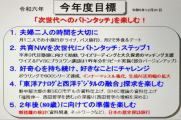 年末に作成した今年度目標5項目を紹介します。 全体のコンセプトは『「次世代へのバトンタッチ」を楽しむ!』にしました。 昨年78歳になり、あと2年で80歳を迎えることになります。時代の変化が激しくなり、またZ世代などとの価値観差も大きくなってきたことを実感しています。そこでライフワークにしてきた共育塾システムを次世代に繋ぐタイミングにあると考えました。 |