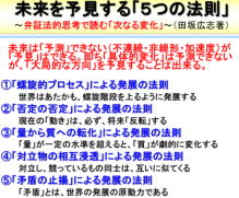 ④「東洋アナログと西洋デジタルの融合」探求を楽しむ 欧米において、この数10年で西洋哲学に基づく活動の行き詰まりが顕在化しており、東洋哲学から学ぶ姿勢が強まっています。「西洋哲学と東洋哲学の融合」が求められていますが、思考的矛盾があるため、ヘーゲルの弁証法を活用した「テーゼ(正)・アンチテーゼ(反)をアウフヘーベン(止揚)することでジンテーゼ(合)を見出す」ような新たな発想を作っていく必要があり、いろんな分野で試行錯誤が始まっています。これも今からの社会を発展させるプロセスに大切な思考です。 |