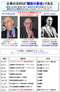 【“プラスワン”と“講義”の位置づけの明確化】 そして相互研鑽の場・定期塾は「プラスワン(経営哲学・基礎講義)」+「自社取り込み発表&意見交換」+「講義(経営全般・基礎講義)」+「会食懇談」と位置づけました。 プラスワンはメンターの知識・経験・技術に基づき体系付けられた「経営者として持つべき視点」や「経営者としての心構え」を多面的に網羅しています。なおプラスワンについては、具体的には17期生からZoom録画を始めており、18期生からは反転授業方式を一部試行している最中です。そして19期生からはZoom録画を活用して反転授業形式で実施できることを目指しています。以後は時代の変化に対応して、必要に応じて平井塾頭のZoom録画コンテンツに切り替えていくことになります。 講義は「経営全般の基礎を学ぶ講座」で、ドラッカーのマネジメント思想(企業の目的は顧客の創造であり、マーケティングとイノベーションが成果をもたらす)を基軸にした業務改善・労務・マーケティング・ITなど幅広く専門家から基礎を学ようにしています。 |