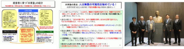 【訪問実感の場の再整備】 「訪問実感の場」は、従来の「ゲストとの会食懇談」を進化させて、17期生から新たにスタートしました。 具体的には、昨年12月に平田機工・平田社長にお願いに行き、ご厚意により「企業紹介、工場・施設見学、平田社長との懇談」を了解いただき、また定期塾講師でお世話になってきたパストラル・市原社長にも「企業訪問、現場見学、市原社長の講話」をお願いし了解をいただき、熊本地場企業で代表的な元気企業4社“平田機工(プライム上場)、重光産業(世界展開)、エコファクトリー(新技術開発)、パストラル(地域密着・6次産業化)”の企業現場を知り、トップとの対話を体感できるようにしました。 |
