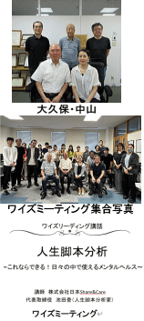 “池田メソッド”とは、『脳科学(前頭葉セラピー)と心理学(TA:人生脚本分析)』を融合した池田さん開発のメンタル・セラピー&カウンセリング手法ですが、ワイズ社員のメンタルヘルスに役立つ話をしてくれています。 池田さんの“思い”の根底にあることは、「人はみな素晴らしい可能性を持っており、子供の時(5~6歳)のトラウマを解決することで、人生の可能性がどんどん広がっていく」「他人は変えることができないが、自分を変えることができる。(セルフコントロール)」があるようです。 |