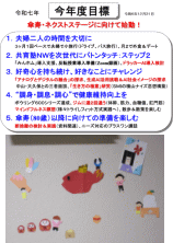 「今年度目標」のトータル・コンセプトは「傘寿・ネクストステージに向けて始動!」に設定しました。大項目5項目のテーマのうち3項目を従来から大きく変えました。そして一つ一つがより具体的にイメージできるものに仕上がった感じです。 夫婦二人の時間を大切にし、共育塾の次世代へのバトンタッチを推し進め、 “好きなことへのチャレンジ”と“健康維持向上”など、ネクストステージに向けての準備をする年にしたいと思います。 本年も、どうぞよろしくお願い致します。 |
