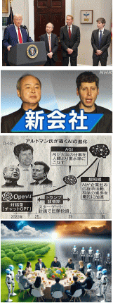 その後も、『トランプ大統領と一緒(SBGの孫会長、オープンAIのアルトマンCEO、オラクルのエルソン会長)に「スターゲート計画」を1/21発表』、日本では『2/3SBG主催の法人向け説明会で“オープンAIと合弁会社設立”を発表したあと、総理大臣官邸で石破総理大臣がSBG孫会長、アメリカのオープンAIのサム・アルトマンCEOと面談』『“超知能AI 10年で実現”オープンAIアルトマンCEO表明(日経新聞2/3)』など新情報が続々と報じられています。 AIエージェントの時代になると、定型業務だけでなく、多くの士業業務さえも“最先端AI技術を把握し活用できる(社内外)人材”に切り替わる時代が来るのかもしれません。今はまだAI革命の序章のようで、今から急激に進化していくことが想像できます。 人間の存在価値が問われる時代になりつつあることを実感しました。 AIを使っているつもりが、いつの間にかAIに使われている可能性もあります。 とんでもない時代が始まりつつありますが、“生成AIの進化情報”の概要は理解して近未来予測を心がけたいと思います。 |