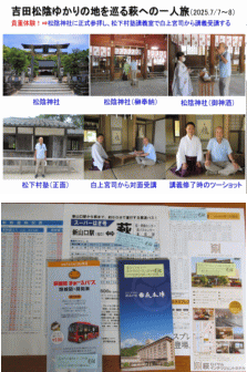 新幹線と高速バス・スーパー萩号を乗り継ぎ、“萩明倫学舎”前で降りて、中尾さんを尋ねて、明倫学舎内にある萩市観光協会に立ち寄りました。そして御礼に持って行った熊本銘菓・陣太鼓を届けたついでに、各種訪問先までの距離感覚や公共交通事情の詳細まで教えてもらいました。おかげで“萩循環まあるバス”もうまく活用できました。 初日・二日目と合わせて、中尾さんとは5回ほど顔を合わす機会があり、萩から帰る時も観光協会のすぐ前にあるバス停まで見送りに来てくれました。 中尾さんに写真を送る必要もあり、少し時間が経ってから萩市観光協会にメールを入れました。 『今回の「吉田松陰をめぐる1泊2日の萩旅行」は、中尾さんのおかげで心に残る素晴らしい旅をすることができました。何よりも、一番印象深かったのは「松陰神社参拝と松下村塾講義室で白上宮司の話が聴けたこと」でした。これも中尾さんに問い合わせたことがキッカケで実現したことで、御縁に感謝しています。』と写真を付けて連絡をしたところ、以下の返信が来ました。 |