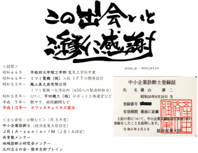 脱サラ半年後から“病院顧問”(親族の病院)と、診断士協会県支部・山下支部長との御縁で“高年齢者雇用アドバイザー”を拝命しながら診断士受験準備を始めました。そして中小企業診断士の資格を取得。資格取得することで、公的機関からいろいろ仕事が来るようになりました。セミナー講師や企業診断指導、各種PJ活動などです。