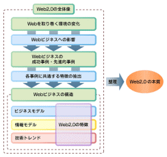 Web2.0では、Webという生態系(ビジネス的要素や技術的 要素)を議論の対象とし、Webの今後の方向性を導き出そう としている。よってWeb2.0の全体像を整理し本質を知ると いうことはすべてのWeb利用者(メーカー、小売業から消費 者まで)にとって有益である。 Web2.0は「Webの世界で起きている新しいトレンドの総称」 である。厳密に何かを定義した仕様ではなく、過去・現在・ 未来において常に変化し続ける“Webを取り巻く環境の変化 をとらえ、Webの今後の方向性を洞察する試みだ。 Web2.0にWebビジネスを成功させる秘訣や上手なWeb利用 方法のヒントが含まれているとすると仮定し、Web2.0の 要素を実践するとなると、やはりWeb2.0の全体像把握や 本質の整理が必要になる。Web2.0の全体像や本質を整理 する手順を図表1-1のように提案する。 |