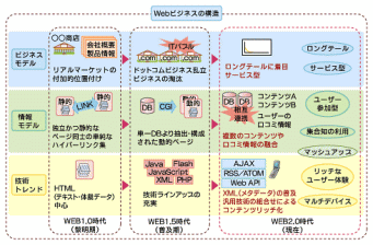さて、図表1-2でWeb2.0の特徴として挙げた7つの キーワード群を図表1-1で示した「ビジネスモデル」 「情報モデル」「技術トレンド」にマッピングしてみよう (図表1-3)。図表1-3の横軸は時間軸を意味し、 Webの黎明期をWeb 1.0、普及期をWeb 1.5、現在の WebをWeb2.0とする。 |