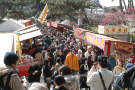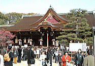 駅前のバスセンターでは、北野天満宮行きのバスは非常に混んで いたが、ギュウギュウ詰めで何とか目的地に到着した。 バス同乗の地元の方から、「今日は梅見の季節だけでなく、梅花祭の 開催日でもある。 年に一度の舞妓さんによる野点があるから、是非見ていくといい。 あなたはこの日に京都に来たのは非常に運がいい。」と言われ、 混雑する理由がよく分かった。 ←写真左:北野天満宮 |