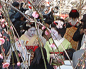 バスを降りて鳥居をくぐると、縁日の屋台が道路に面したところから 境内まで続いており、ものすごい人波であった。屋台を過ぎて境内に 入り、本殿の入口付近で茶会が行われていた。境内の梅も見頃となり 馥郁たる雰囲気の中、多くの参拝観梅者で賑わっており、舞妓さんの 艶やかさと、茶会参加希望の長蛇の列で、参列することは諦めて、 周辺から梅園や舞妓さんの立ち振る舞いを楽しむことにした。 天正15年(1587)豊臣秀吉公が当宮境内で北野大茶湯を催した故事に 因んで上七軒総出(芸妓15名・女将15名)の奉仕により、御祭神 菅原道真公1050年 大萬燈祭あたる昭和27年から毎年 「梅花祭野点大茶湯」を開催しているそうである。 写真右上:賑わう縁日の様子 同下:野点をする舞妓さんたち ⇒ |