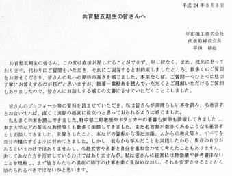 5.私に託されたもの このような経緯があるわけだが、暫く経ってから秘書とのやりとりの結果、長男の平田社長の了解の下に、平成24年8月3日付の「共育塾5期生のみなさまへ」というA4用紙2枚の文書を、受け取ることになった。 平田会長が、最後に若手経営者(共育塾5期生)へのメッセージを思考され、残された文書を、私に託されたことに対して、私なりに「平田会長の次世代伝承の思い」を強く感じている。今からの激変していく社会に対して、次世代を担う若者に伝えるように、私に託された感覚を持っている。 |