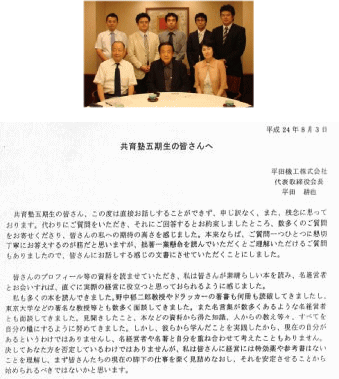 平田耕也氏には、私が平田機工に勤務した13年間、直属の部下としてお世話になり、私自身が結果的に、価値観を含めて大きな影響を受けたと感じている。脱サラ後も、私が創った若手経営者塾「共育塾」にも共感・協力いただいてきたが、残念ながら5期生(2012年度)の時に急逝された。そして亡くなる直前に思考・生成された「5期生の皆さんへ」という若手経営者へのメッセージを、私が預かることとなった。私はこの事実を、平田会長から「熊本の若手経営者に伝えてほしい」と託されたように感じている。 しかし文章で書かれたものは、どうしても抽象的な内容となり、一つ一つの言葉の中に込められた「経営の心(起業家精神)」まで伝えることは難しく、「5期生の皆さんへ」も同様である。 私には13年間、平田耕也氏の部下として一緒に仕事をした経験、脱サラ後の共育塾での会食懇談等を通して、平田会長から得て実感したモノ・コトがたくさんある。加えて経営コンサルタントとして多くの経営者とも接し、経営者の生き方(生き様)や、その背景やマインドを客観的に分析・解釈が可能で、それらを融合して次の時代を担う若手経営者に伝えること、意見交換することで、次世代経営者育成にお役立ちできればと考えている。 |