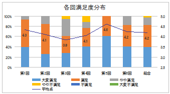 今回の基礎セミナーでは、コアメンバー5人に加え、多くのオブザーバーの協力を得て実施して、受講生の反応のバラつきを感じながらも、受講申込者数48名、受講者数29名に対して23名に修了証を渡すことができた。 またアンケートは最終日にとったが、受講生21人全員から回収し、意見欄についても18人が真摯な記載をしてくれたことに感謝している。各回の評価についても、5段階評価で第1回から4.3→4.1→3.8→4.1→4.6→4.2の推移で、総合平均が4.2となっており、受講生からはそれなりに高い満足度を示してもらえたと思う。 |
