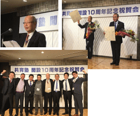 最近の共育塾キックオフ&修了式時の司会をしてくれる5期生・井上さんの司会で、祝賀会が始まったが、先ずは那須社長が時間をかけて作成してくれた「共育塾10年の歩みDVD」の放映から始まった。音楽をバックに、1期生から10期生までのキックオフ、定期塾風景、ゲストとの会食懇談、支援機関訪問、企業相互訪問など、順次紹介されていったが一つ一つの画像に思い出があり、ワンシーン、ワンシーンを感無量で見続けた。後日、このDVDを那須社長からプレゼントしてもらい、家内と一緒に見てこの10年の思い出話をすることができ、祝賀会での喜びを家内とも共有できた。このDVDをつくってくれた那須社長に感謝! |