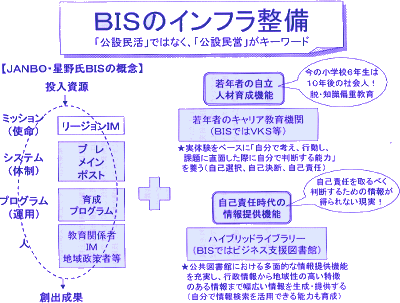前回、自立化社会のインフラ整備として『若年者の自立人材育成機能の充実』と『自己責任時代の必要情報提供機能の充実』の二つの機能の重要性に触れたわけであるが、これを「BIS(ビジネス・インキュベーション・システム)づくり」に絞って考えてみると、右図のような構造で考えることができる。 自立化社会における現在のビジネス支援推進施策の柱の一つとして『ビジネス・インキュベーション・システムの推進』があるが、それに付随する2つの機能として『ベンチャーキッズスクール等の自立化人材教育の推進』と『ビジネス支援図書館づくりの推進』があることになる。 |