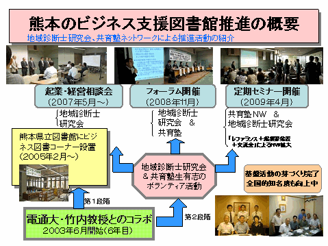 今までも「中小企業診断士によるビジネス支援図書館推進活動は、熊本が発信地」であることを、少しは行ってきたが、本格的に全国発信することを始めたのも、丁度この頃からである。具体的には、ビジネス支援図書館推進協議会へのメール投稿を多面的に行ったり、中小企業診断協会の冊子「企業診断ニュース」への投稿も始めたりするとともに、私自身がプレゼン資料を作成して、中企庁、九経局や県・市の方々へのプレゼンテーションや、セミナー・講演等を通して、多くの方々に対してアピールを行ってきた。おかげさまで継続的に地方経済雑誌に採り上げてもらったりもできたし、最近では他県での中小企業診断士と県立図書館との連携の話も、数多く聞くようになってきている。 |